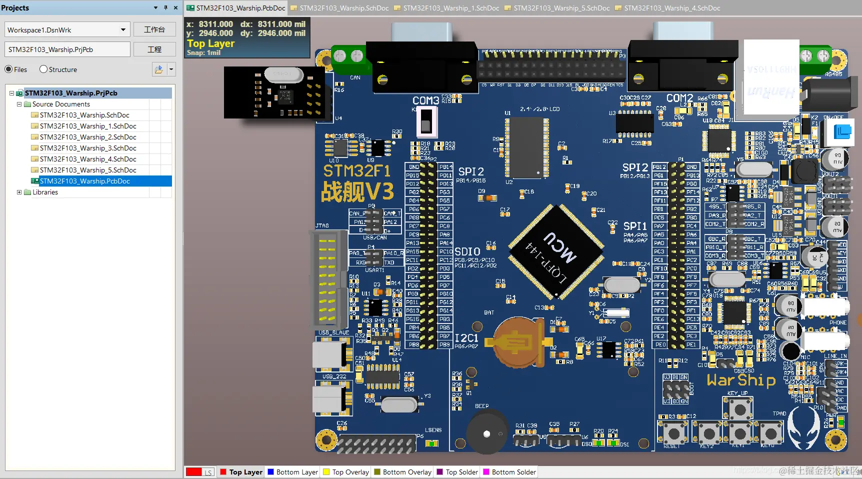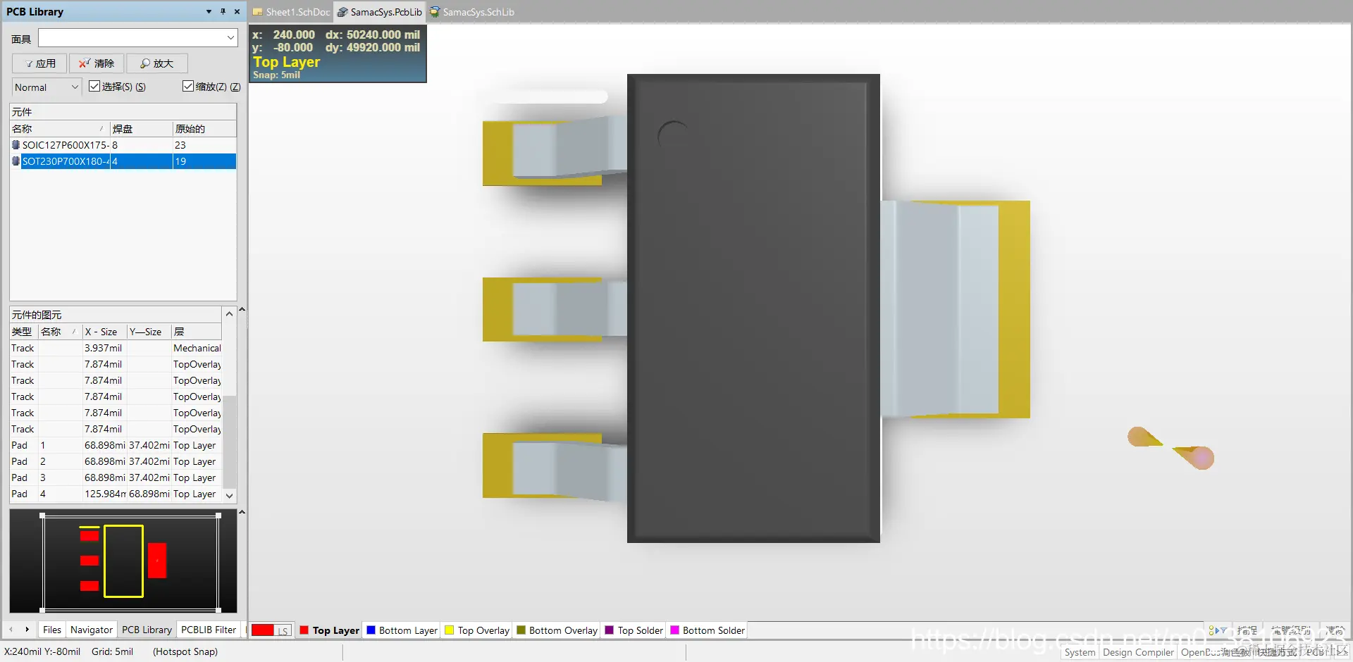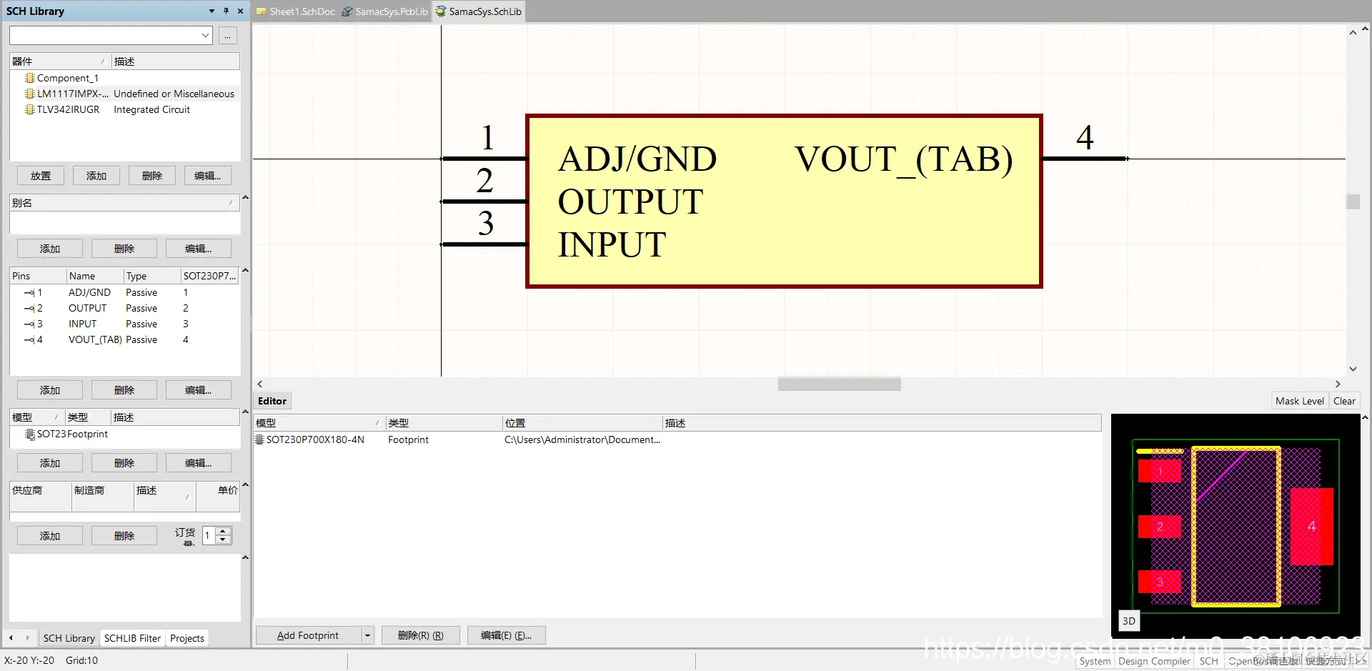 此时Altium Designer中自动添加了LM1117的原理图封装和PCB封装,通常Altium Library Loader插件下载的均为3D库,效果很棒如下图所示: