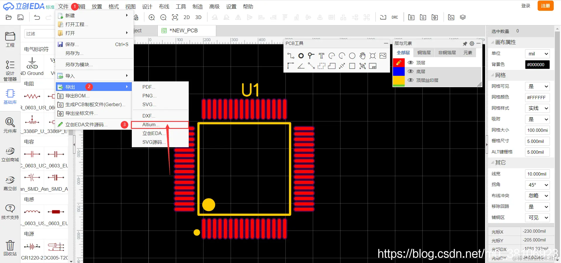 第4步:点击 【文件->导出】 ,即可下载原理图库和PCB库,这里我使用AD(Altium Designer),所以下载为AD(Altium Designer)文件格式就直接可以使用了,如下图所示:
