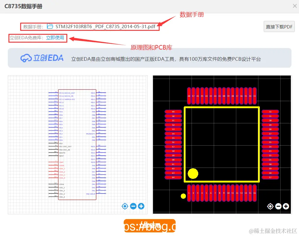 举个例子,我需要查找元器件:STM32F103RBT6的原理图封装和PCB封装。