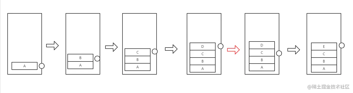 从A页面一步步跳转至D页面,然后从D页面返回到C页面,这时你会发现只是指针移动到了C页面,history的length并不会减少,从C页面跳转至E页面时,E页面会把D页面直接替换掉。