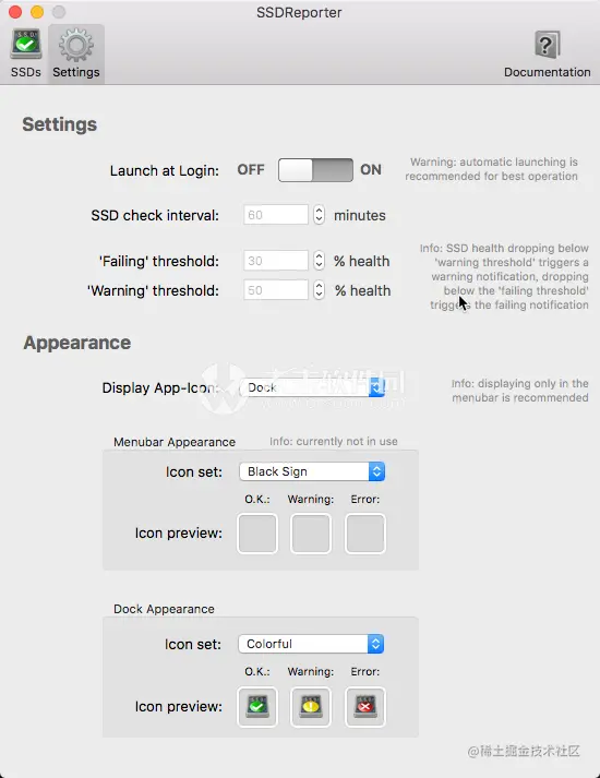 SSDReporter是一个应用程序,检查您的内部固态磁盘(“SSD”又名“闪存”)的健康状况。 由于SSD的写入操作次数决定了生命周期的有限性,所以请务必留意SSD的状态。 每当SSD的运行状况下降和/或运行状况低于“警告”或“错误”阈值时,SSDReporter就可以通过电子邮件或屏幕提醒您。 SSD固态硬盘的当前状态也总是很容易被识别,因为SSD固态硬盘降低时SSDReporter将其图标(可选地在菜单栏中)从绿色更改为黄色(警告阈值),最后红色(错误阈值)。 原文地址mac.orsoon.com/Mac/155713.…