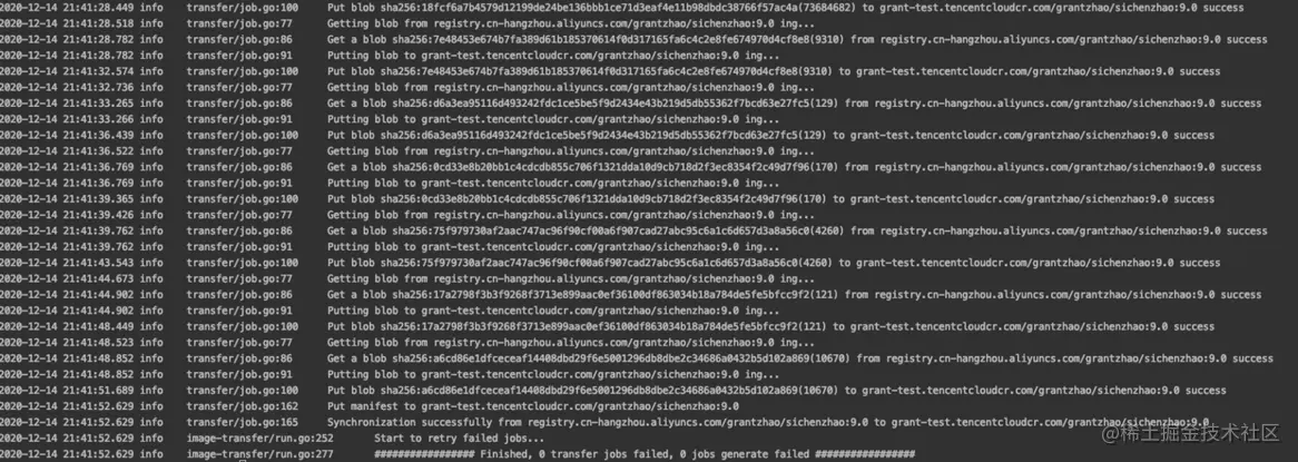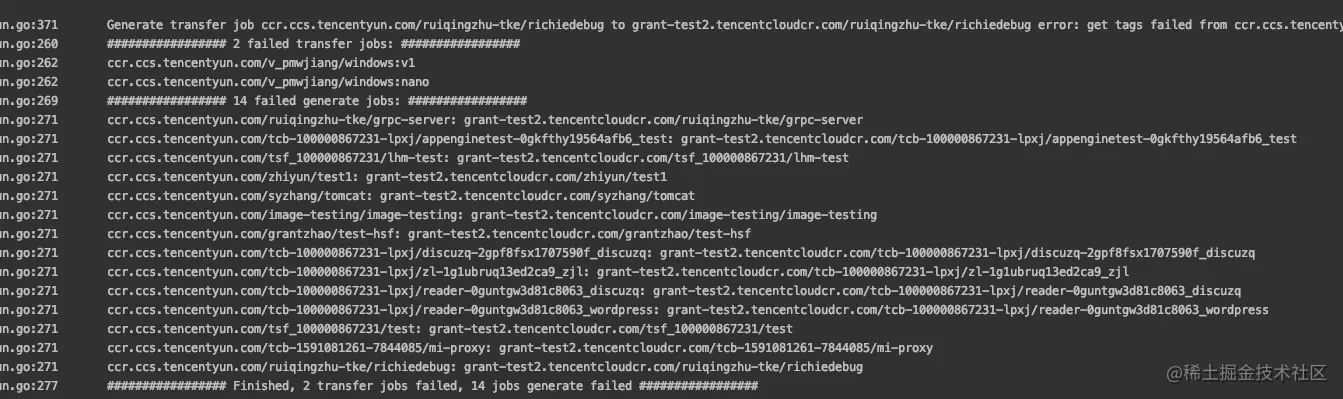 最后可以看到,有 16 个 job 失败了。工具最后会列出失败的 job 的源镜像地址和目的镜像地址。对于这些失败的 job,去仓库检查后发现,这些 job 的 tag 是失效的。因此传输失败。