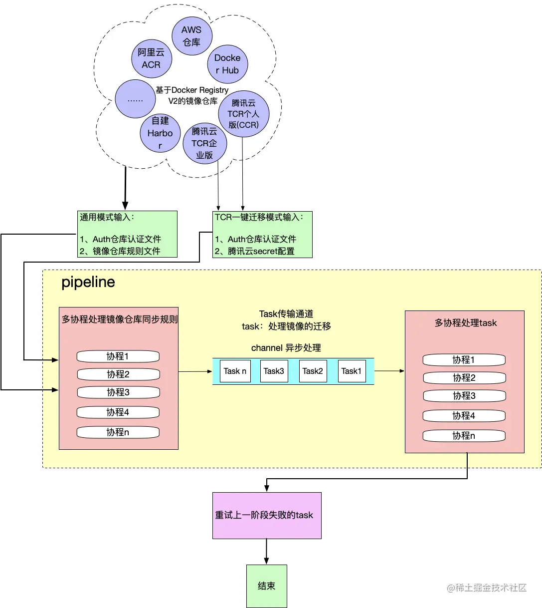 pipeline:该模块是工具处理镜像迁移的核心。负责处理用户下发的镜像迁移任务,包括根据迁移配置文件处理镜像仓库的同步规则,以及进行镜像的分层拉取和传输任务。模块采用了高并发的 pipeline 模型,提高迁移速度。