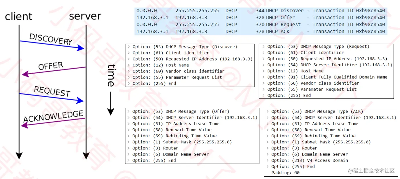 - 客户端会在租期不足的时候,自动向DHCP服务器发送