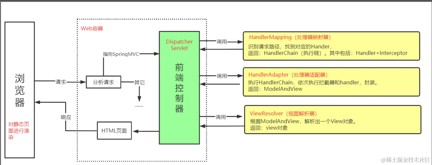 概念: springmvc是spring框架的控制层技术,核心是前端控制器 DispatcherServlet,负责管理和调用其它组件以处理用户的http请求,降低组件间的耦合度: