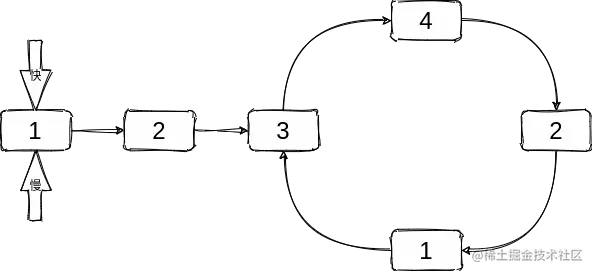 这题成环问题直接就联想想到快慢指针,一条道两个人跑步一快一慢,如果没环则永远不会追上,有环则会相遇。大概如下(慢的走一步、快的走两步):