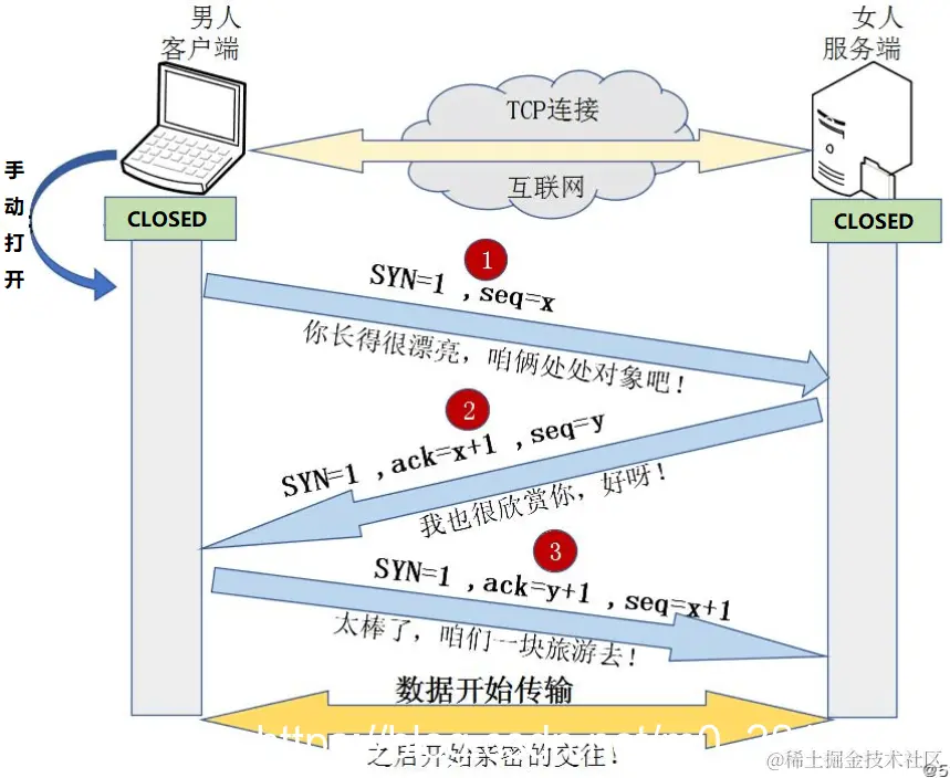 可通过以下趣味图解理解三次握手: