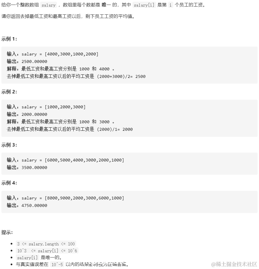 一次遍历找出最大max、最小min和总和sum,平均值average = (sum - max - min) / (salarySize - 2),没有难度,只需要注意数据类型即可。