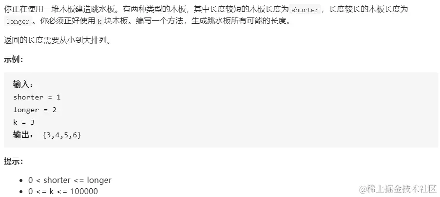 1、如果 k=0k=0,则不能建造任何跳水板,因此返回空数组。