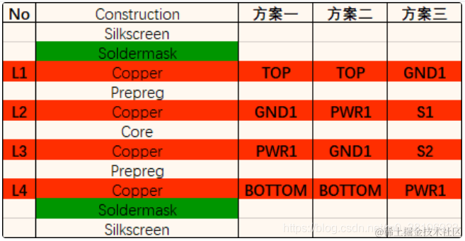 方案一:为常见四层PCB的主选层设置方案。