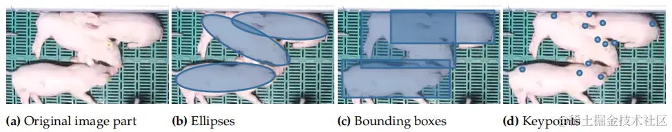 这项研究所使用的数据来自一家传统的仔猪养殖场。这里共安装了 5 个摄像头,每个摄像头覆盖两个 5.69 平方米的畜栏,每个畜栏最多有 13 头猪。这些猪 27 天大时入栏,在养殖场里待 40 天。该数据集涵盖养殖场四个月的数据。然后从所有可用视频中随机选取 1000 个分辨率为 1280x800 像素的帧,并进行人工标注。