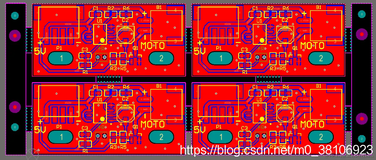 这里我打算设计一张PCB板上有4块成品单元数量,所以需要将以上设计好邮票孔的PCB板进行复制。