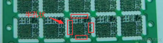 空心连接条连接方式和邮票孔类似,区别在于连接条的连接部分更窄一点,而且两边没有过孔。这种方式有一个缺点就是板子掰开之后会有一个很明显的凸点,而邮票孔的凸点由于被过孔分开所以不怎么明显。既然这样为什么还要使用这种方式呢?直接使用邮票孔不就行了。其实有一种情况邮票孔和V割都无法使用的,那就是做四周都是半孔模块的时候,只能通过空心连接条在模块四个角进行连接,实物如下图所示: