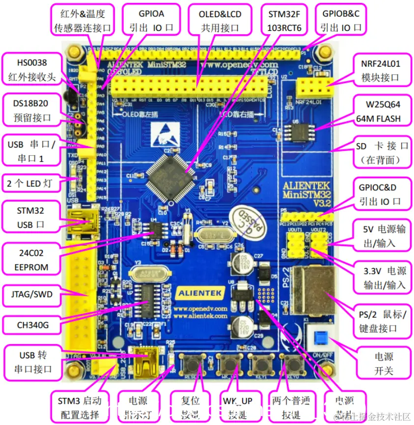 - 4个功能按钮,其中KEY_UP兼具唤醒功能