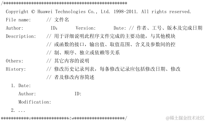 正确示例:下面这段头文件的头注释比较标准,当然,并不局限于此格式,但上述信息建议要包含在内。