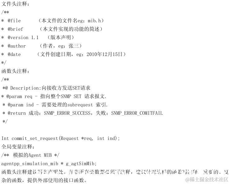 采用工具可识别的注释格式,例如doxygen格式,方便工具导出注释形成帮助文档。以doxygen格式为例,文件头,函数和全部变量的注释的示例如下: