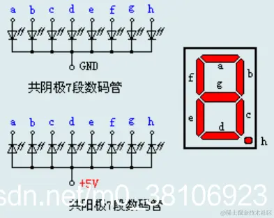 7段数码管中亮段的发光原理和普通的发光二极管是一样的,所以可以把这7个亮段看成7个发光二极管,根据内部7个发光二极管的共连端不同,可将七段数码管分为共阳(共阳极)和共阴(共阴极)两种。共阳极就是把所有LED的阳极(正极)连接到