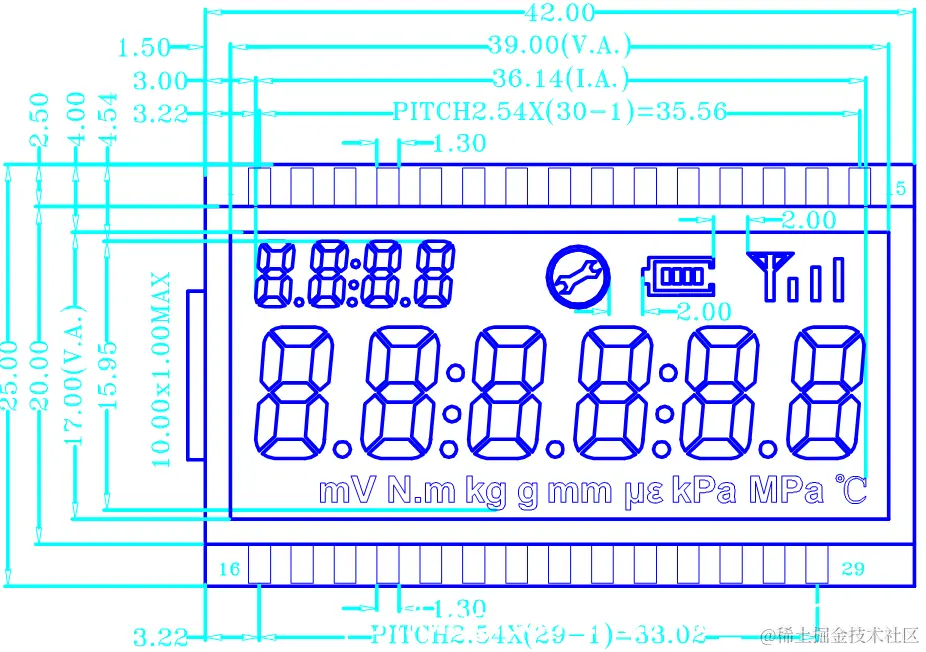 该LCD数码屏有4个公共端,29个端口,在不借助驱动芯片的前提下,要保证MCU有29个富余的IO口,LCD数码屏引脚对应特性如下图所示: