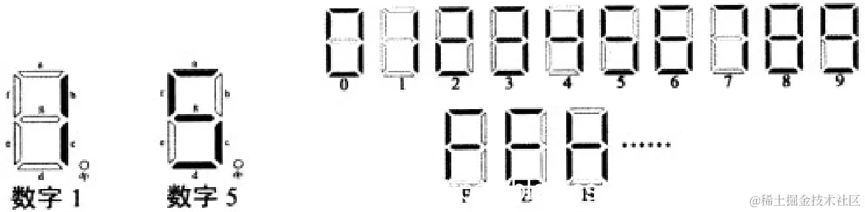 7段数码管有多种颜色、多种尺寸供设计时使用,它们的显示原理相同。如果要7段数码管显示数字1,只要点亮b、c两段即可;如要显示数字5,则需要点亮a、f、g、c、d段。其他数字和一些字母可以按照下图中的说明点亮对应的亮段来显示,7个亮段可以灵活地表现数字和一些字母信息。