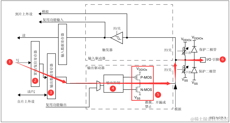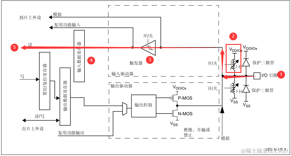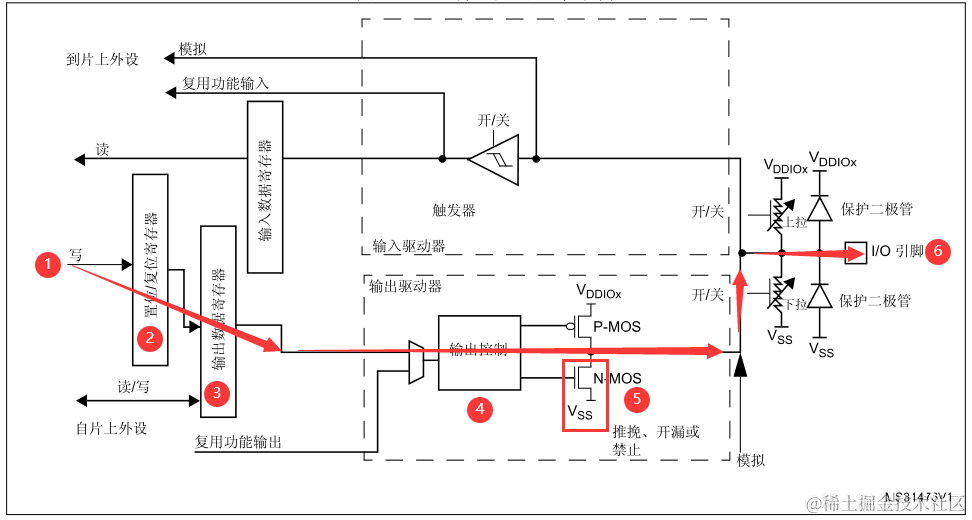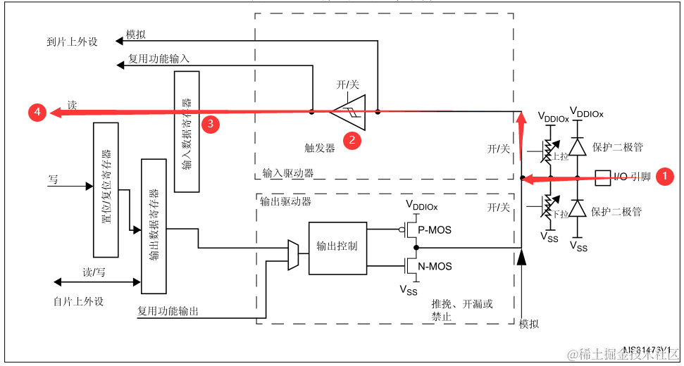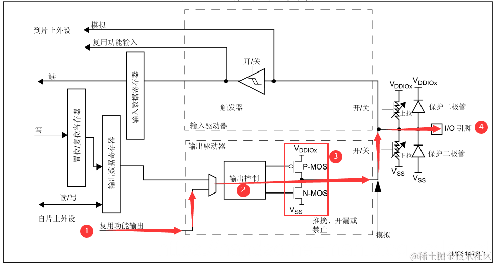 1、保护二极管:防止I/O引脚外部过高、过低的电压输入,当引脚电压高于VDDIOx时,上方的二极管导通;当引脚电压低于VSS时,下方的二极管导通,防止不正常电压引入芯片导致芯片烧毁。