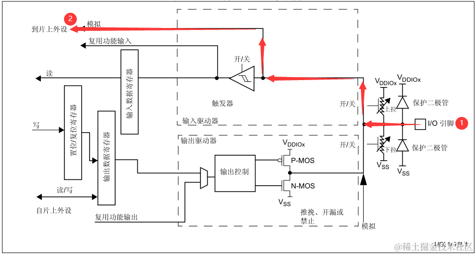 2、开关:开关为TTL肖特基触发器,将模拟信号转化为0和1的数字信号,但当GPIO作为ADC采集电压通道时,此时信号不再经过触发器进行TTL电平转换。