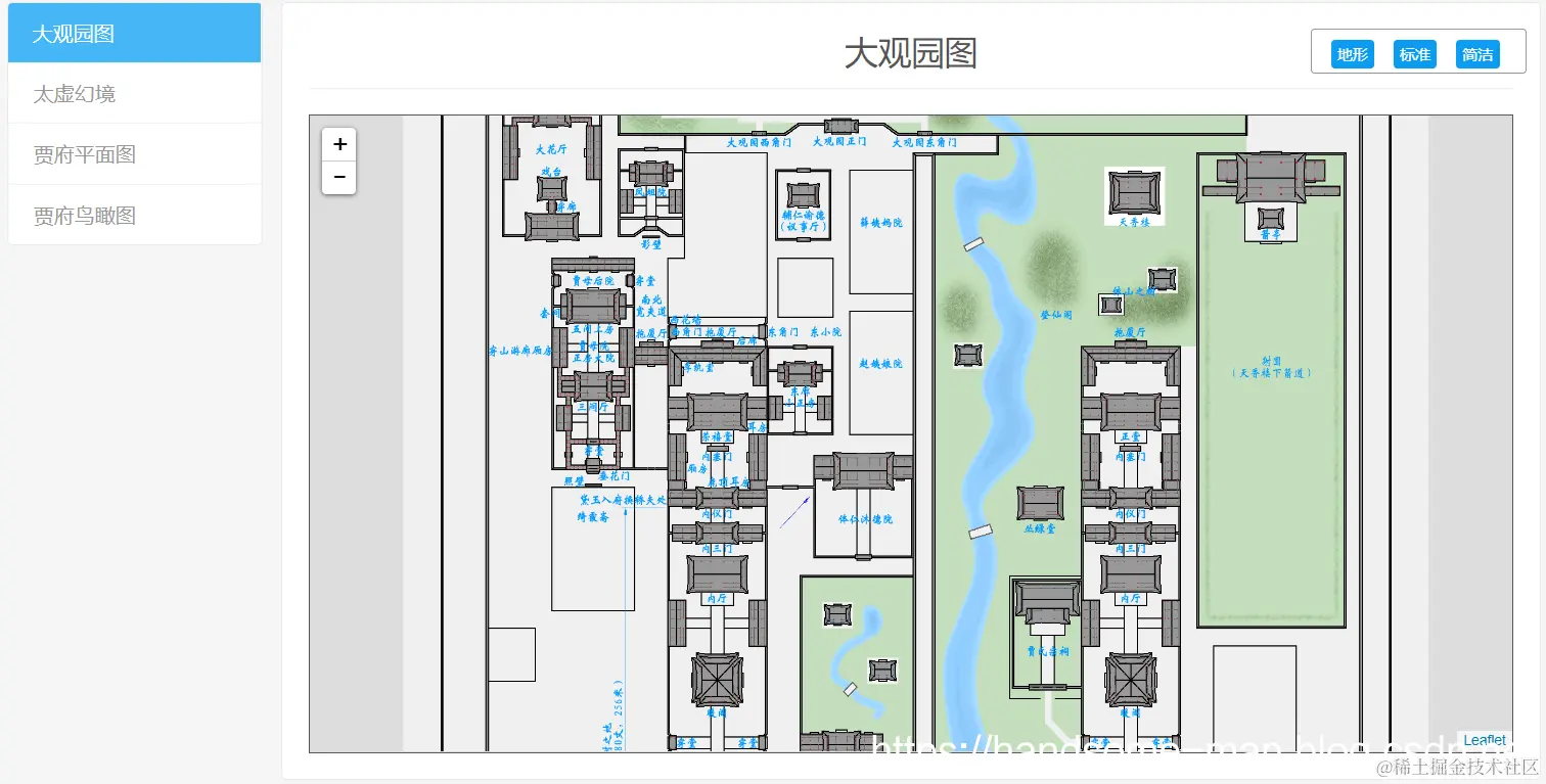可以详细看到大观园全局图、太虚幻境图、贾府平面图和鸟瞰图。