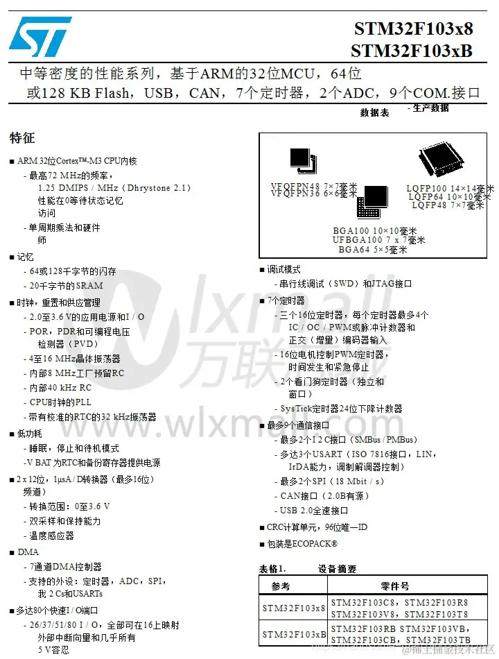STM32F103C8T6是一款基于ARM Cortex-M 内核STM32系列的32位的微控制器,程序存储器容量是64KB(STM32F103CBT6存储器容量128KB),需要电压2V~3.6V,工作温度为-40°C ~ 85°C。