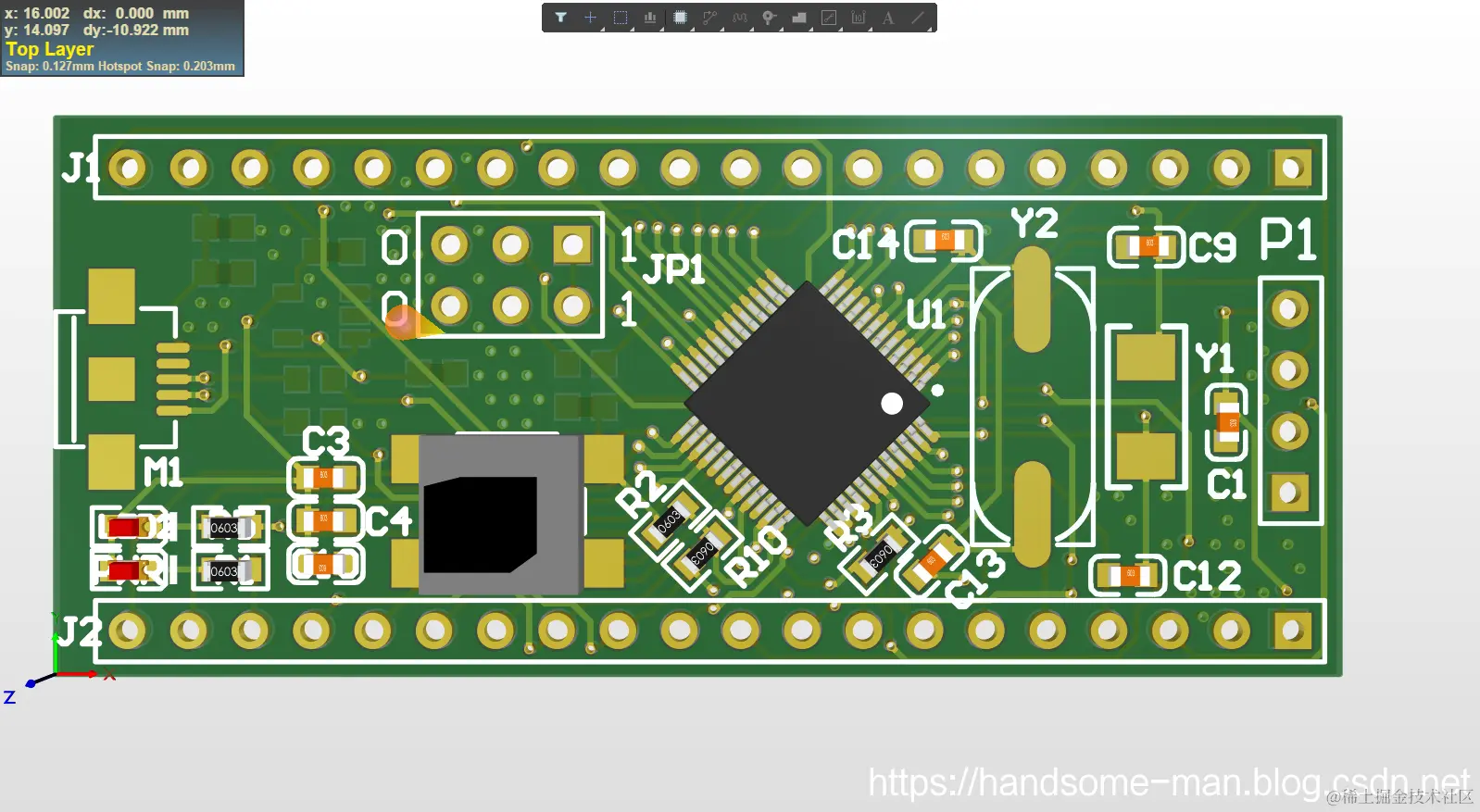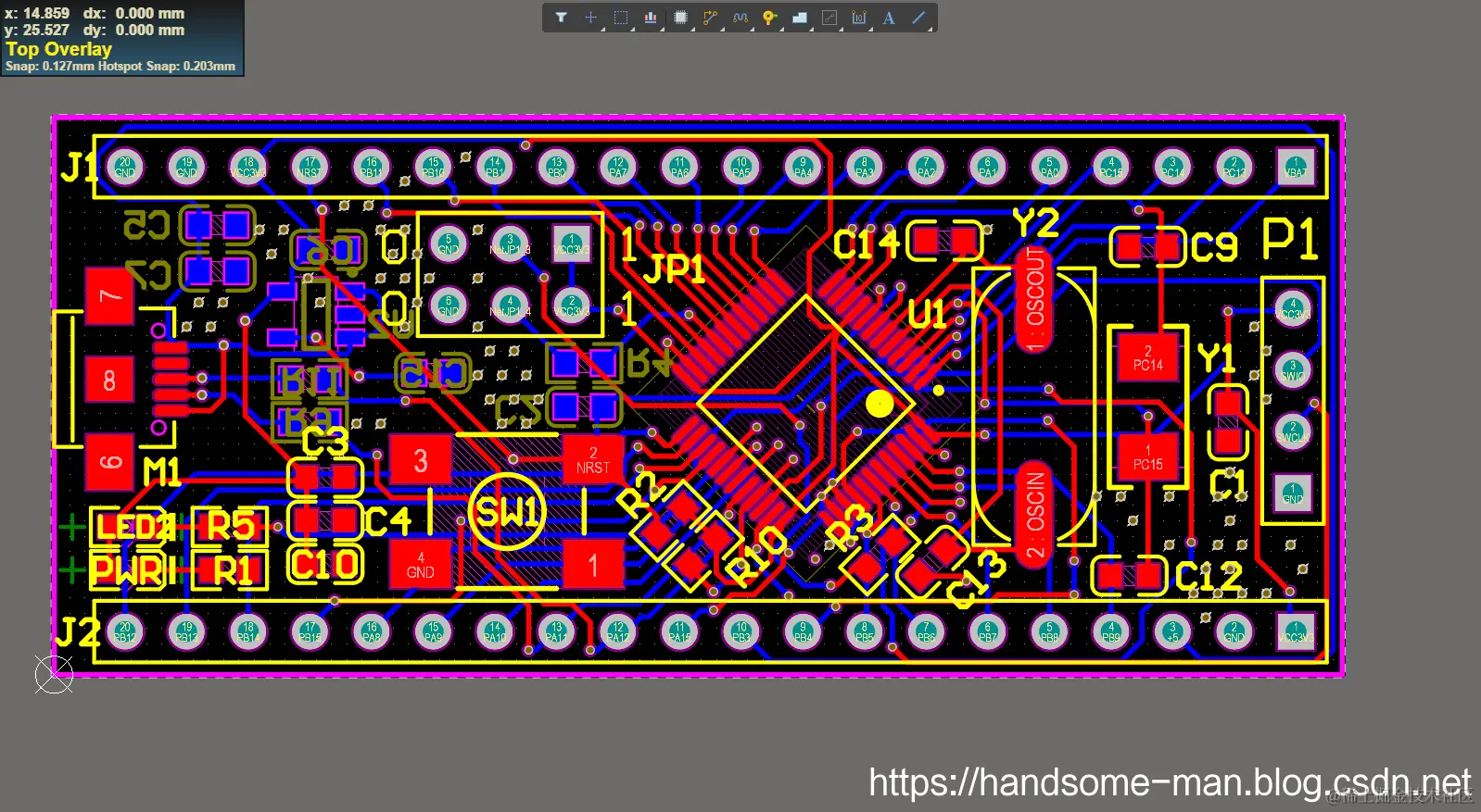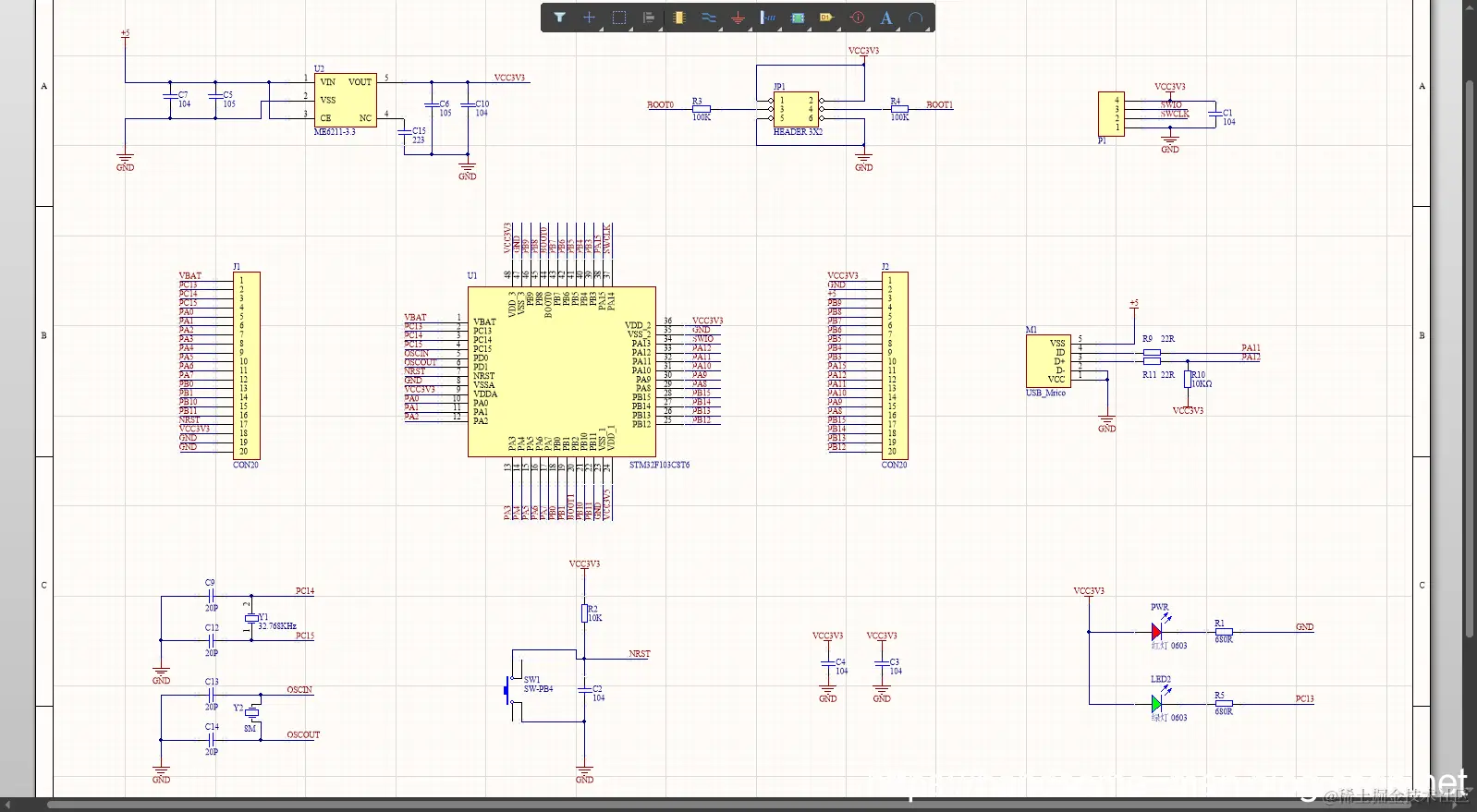 将 STM32F103C8T6(STM32F103X8和STM32F103XB的最小系统一致,不过是闪存不同,具体差异参见:STM32选型)最小系统原理图、PCB开源给小伙伴,效果如下所示: