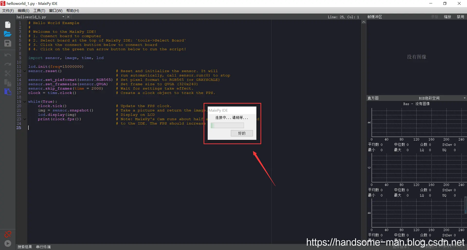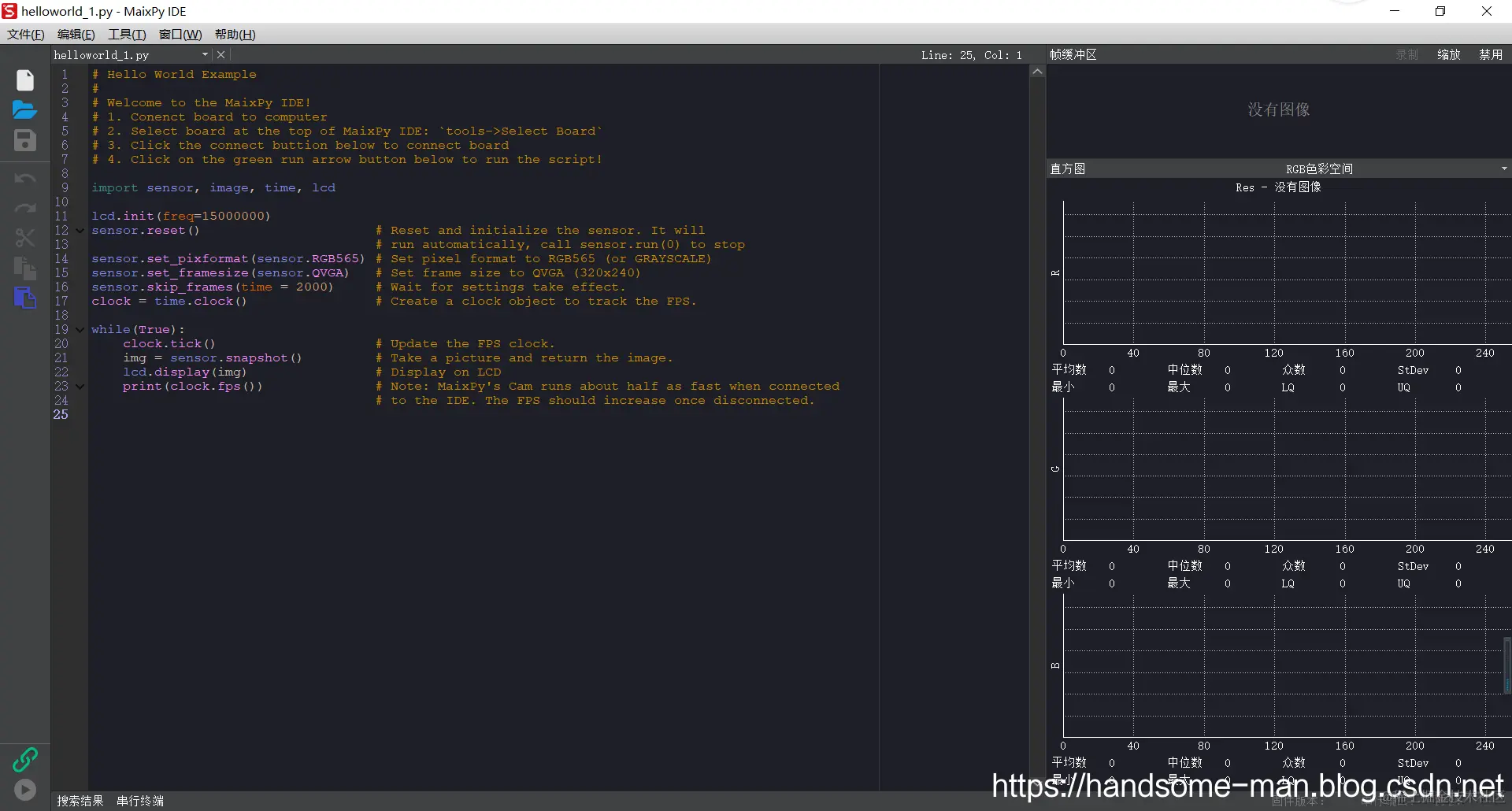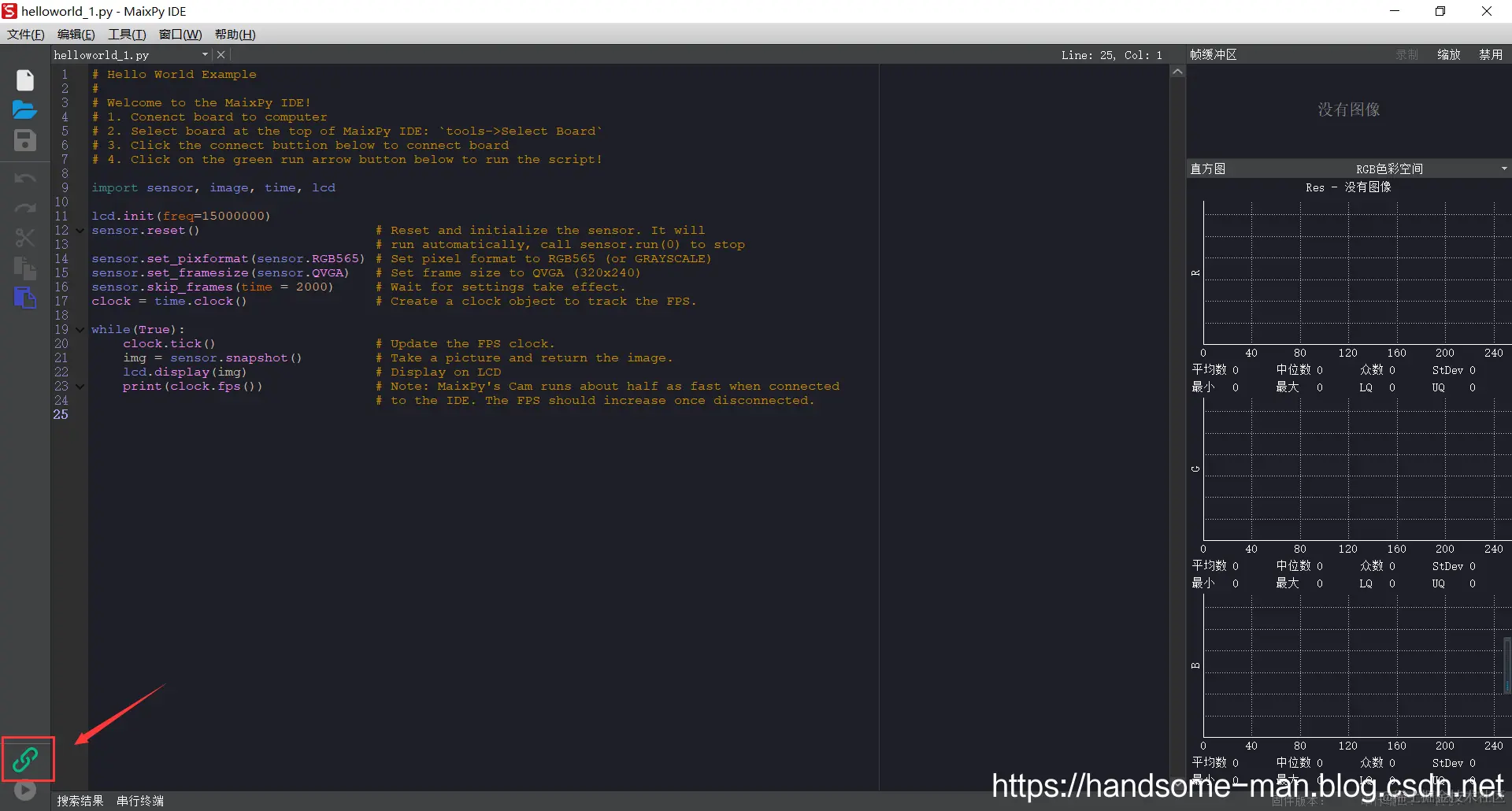 打开MaixPy IDE,会出现一下打开摄像头的示例代码。