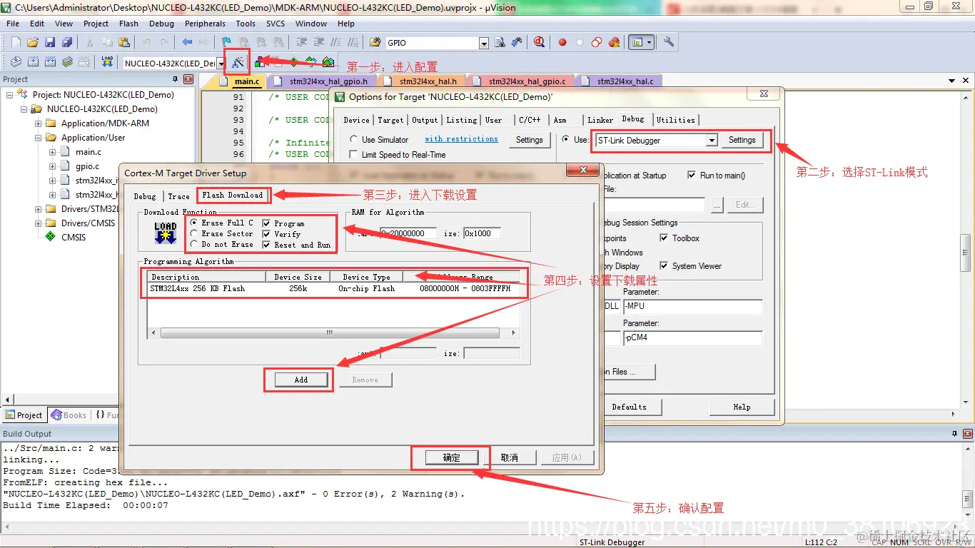 NUCLEO-L432KC模块内嵌STLINK/V2-1烧写器,配置烧写参数,设置使用 ST-LINK 下载,设置好下图参数,点击下载程序。