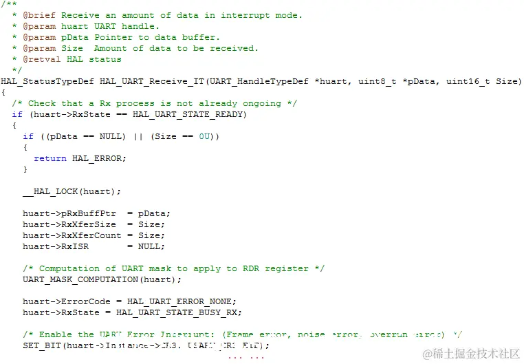 HAL_StatusTypeDef HAL_UART_Receive_IT(UART_HandleTypeDef *huart, uint8_t *pData, uint16_t Size),功能是串口接收函数,会触发接收中断,函数各个参数说明如下:
