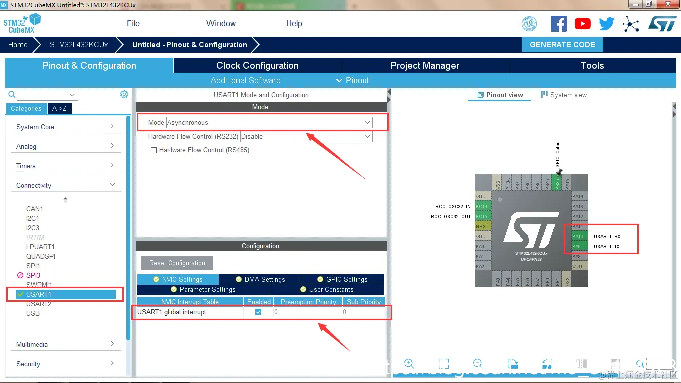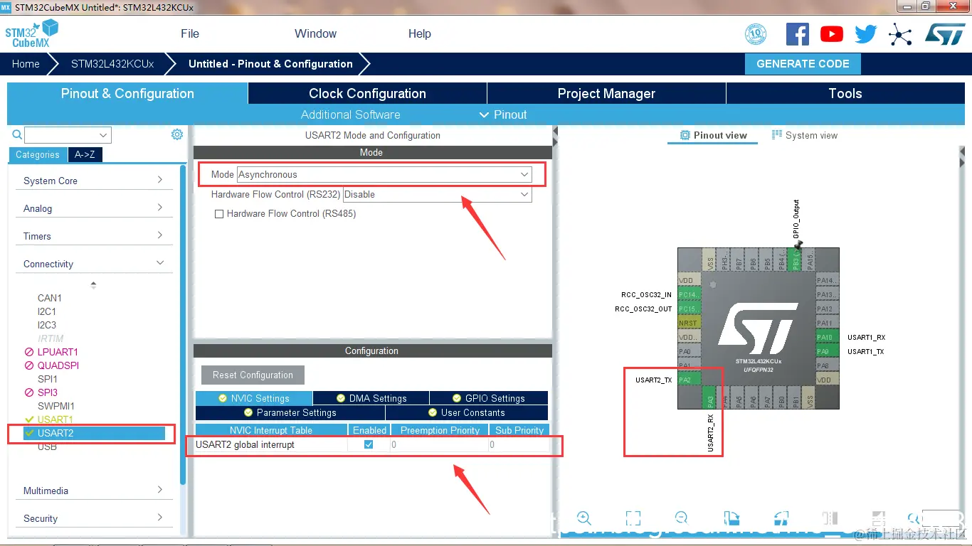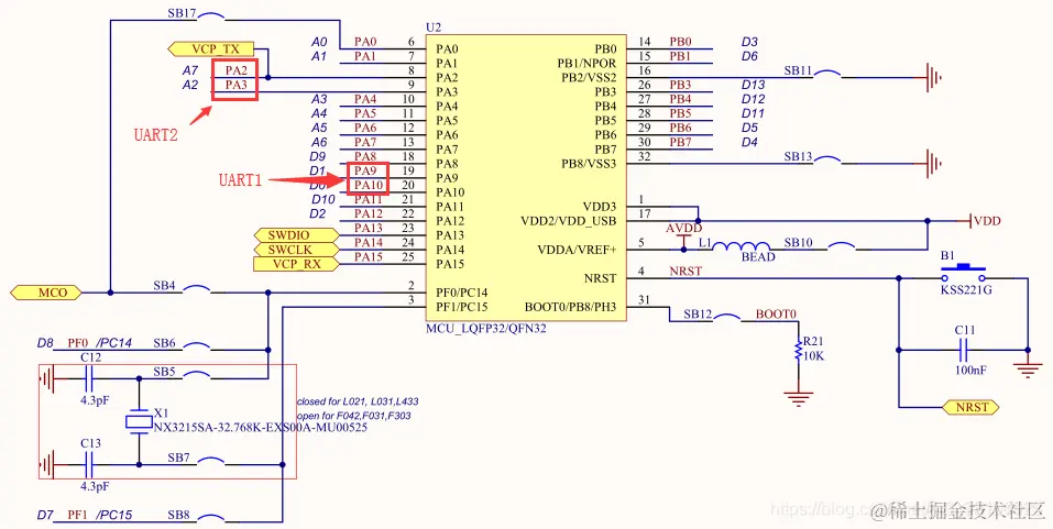 - 分析STM32L432KC芯片手册可知,UART1(TX=PA9,RX=PA10)和UART2(TX=PA2,RX=PA3)的GPIO端口及属性;