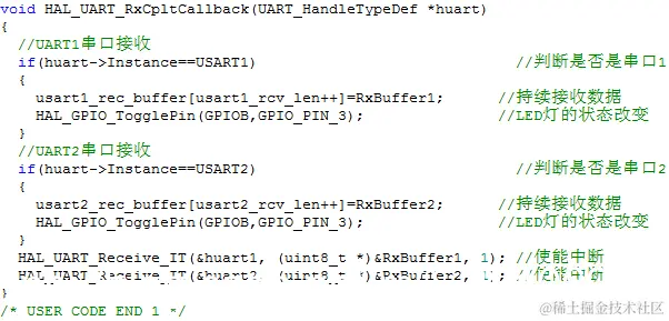 在“uart.c”文件中编写中断接收函数,接收到UART1或UART2串口数据时,LED等状态会自动取反改变。