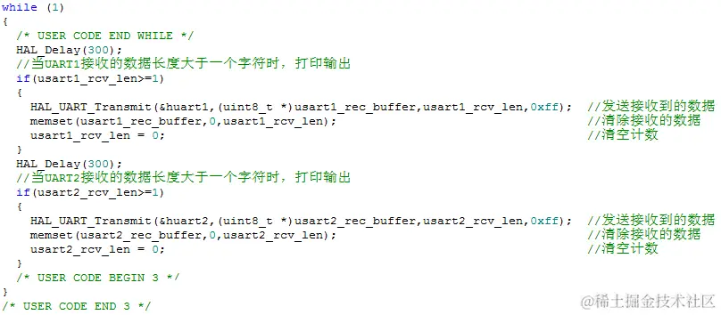 在main函数的while循环中编写串口接收处理函数,这里我是将接收的数据打印显示。