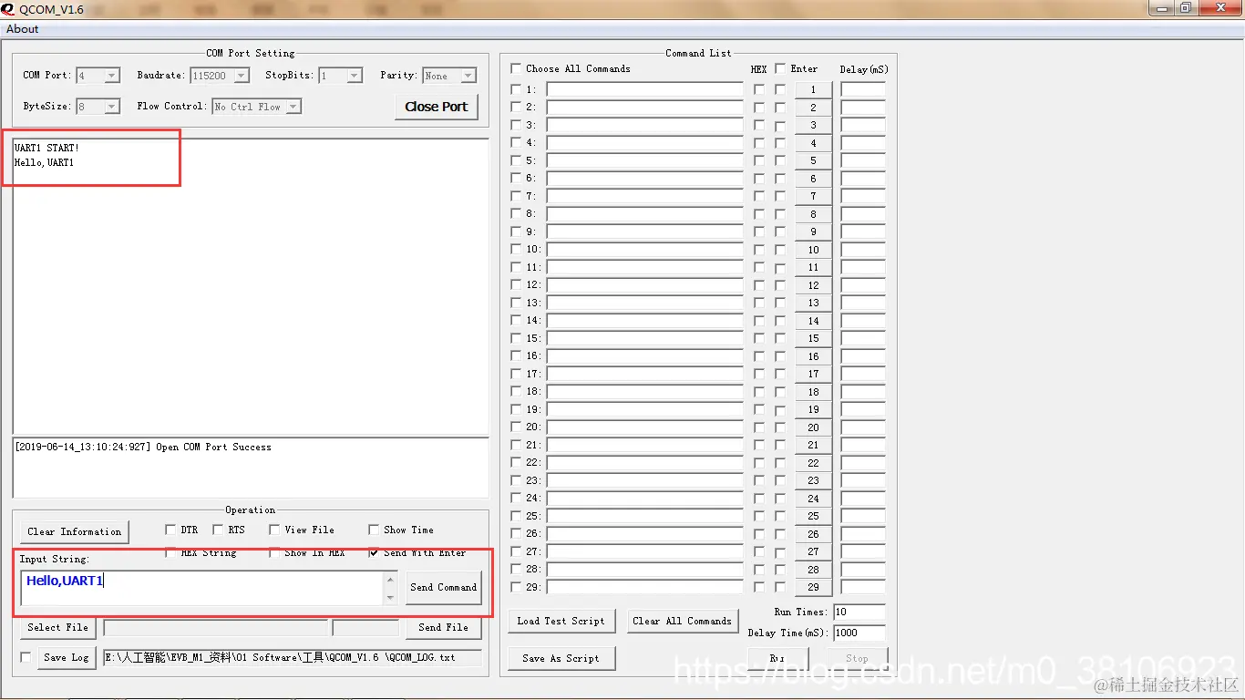 使用串口调试助手,查看双串口数据收、发通信 。