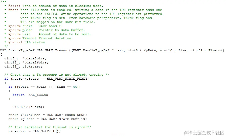 HAL_StatusTypeDef HAL_UART_Transmit(UART_HandleTypeDef *huart, uint8_t *pData, uint16_t Size, uint32_t Timeout),功能是串口发送函数,函数各个参数说明如下: