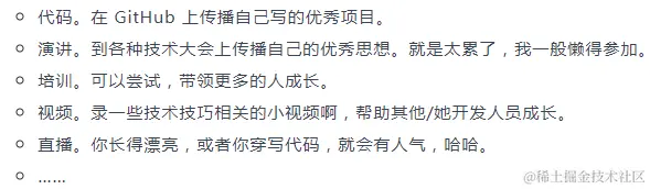 - 扩大媒介。技术影响力有多种形式,代码、文章、演讲、Slide、培训等等。