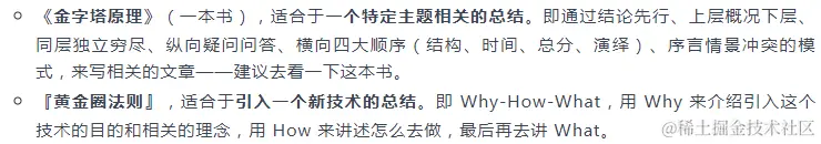 两种模式,各自有各自的特点。大部分的技术文章,都可以用这种模式业写。不过呢,《金字塔原理》并只不是一个模式,而是一系列模式的结合。它更适合于写出『使用 Flutter 收获的六点经验』blabla 类型的文章。而『黄金圈法则』,则类似于我在前几天引入的《无代码编程》,适合于介绍新技术——新技术能解决现有的痛点。