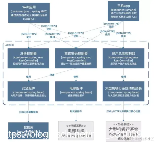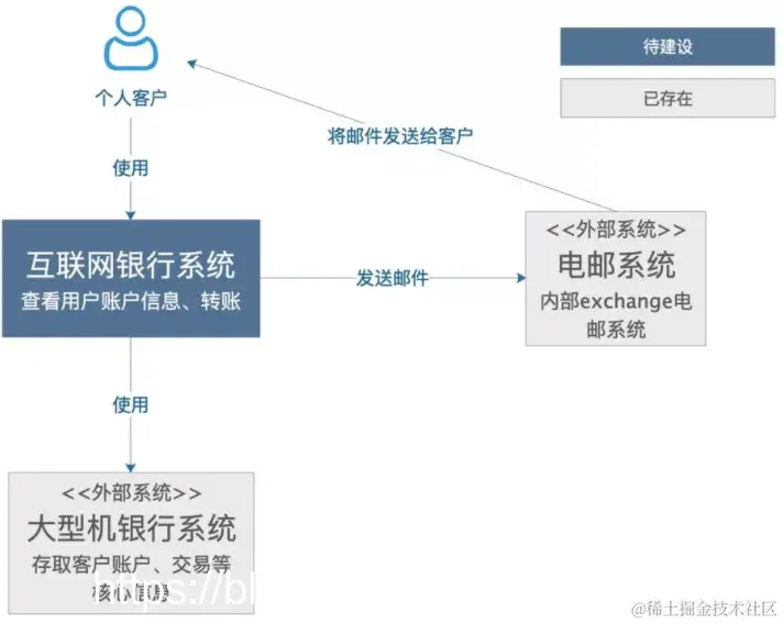 这是一个想象的待建设的互联网银行系统,它使用外部的大型机银行系统存取客户账户、交易信息,通过外部电邮系统给客户发邮件。可以看到,非常简单、清晰,相信不需要解释,都看的明白,里面包含了需要建设的系统本身,系统的客户,和这个系统有交互的周边系统。