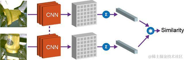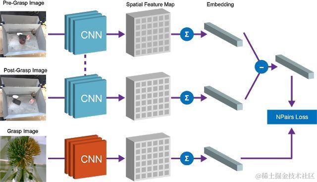 Google使用完全卷积架构和简单的度量学习算法来实现这种等式关系。在训练时,下图中展示的架构会将抓取前和抓取后的图像嵌入到密集空间特征图中。这些特征图经平均池化后变为向量,“抓取前” 和 “抓取后” 向量之间的差异代表一组物体。该向量和被抓取物体的相应向量表征会通过 N 配对目标归于等价。