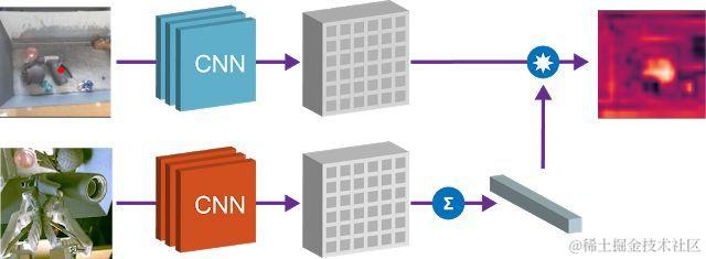 使用 Grasp2Vec 嵌入在场景中寻找物体。左上方的图像展示了箱子中的物体。左下方是我们希望抓取的查询对象。通过将查询对象向量的点积与场景图像的空间特征相结合,我们得到每像素的 “激活图”(右上方的图像),其中展示了图像中的相应区域与查询对象的相似度。此响应图可用于寻找要抓取的物体