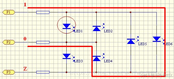如果我们仔细看看上面的设计,我们会注意到,例如我们想点亮 D1,可以令 Net1=1,Net2=0,Net3=Z,这样,D1 就亮起来了,什么问题也没有,可是如果 D1 损坏,或者没有安装时,问题就来了。当电源电压较高时(例如 5V),会形成图中箭头所示电流回路,造成 D4、D5 两只 LED 被意外点亮,而 3V 电压为什么没事呢,因为对于大部分 LED,3V 电压还没达到LED 压降的两倍,所以不会导致两只二极管串联导通(称之为二极管连锁现象)。
