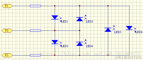 这是一张 3 个 IO 驱动 6 只 LED 的简化版电路图,电阻在这里起限流决定性作用: