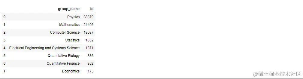 下面统计在计算机各个子领域2019年后的paper数量,我们同样使用 merge 函数,对于两个dataframe 共同的特征 categories 进行合并并且进行查询。然后我们再对于数据进行统计和排序从而得到以下的结果: