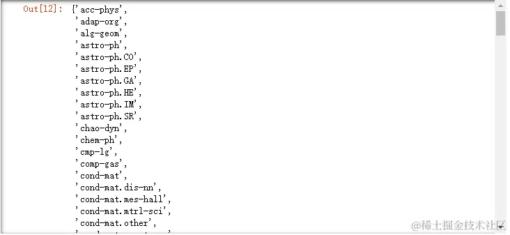 从以上结果发现,共有176种论文种类,比我们直接从arxiv.org/help/api/us…的 5.3 小节的 Subject Classifications 的部分或arxiv.org/category_ta… 中的到的类别少,这说明存在一些官网上没有的类别,这是一个小细节。不过对于我们的计算机方向的论文没有影响,依然是以下的40个类别,我们从原数据中提取的和从官网的到的种类是可以一一对应的。