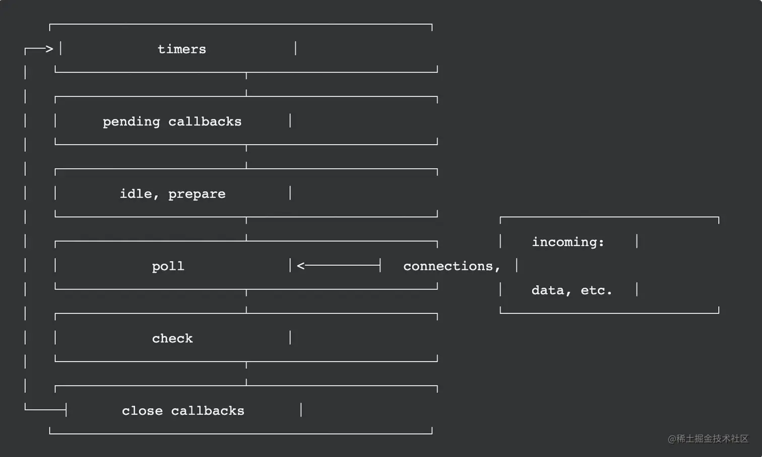 在每次运行的事件循环之间,node.js会检查自己是否在等待任何异步I/O或计时器,如果没有则完全关闭。图中的timer、poll 、pending callback、check......每一行都是一个队列。所以他的任务是被分配到不同的队列中的,当主栈代码执行完后会进入图中的执行队列中,依次扫描。
