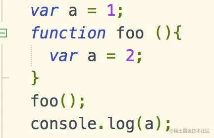 需要注意的是var a = 2;这一行代码,在foo()当中创建的a变量只是一个临时变量,并不等同于外部的全局a变量,并不会挂载在window对象当中,所以当函数调用完成以后,该函数被弹出调用栈,js进行内存清理,于是内部a被销毁,最后打印a,a=1