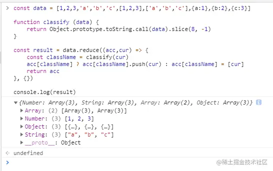 这个场景大多数是数据归类,例如把数据 [1,2,3,'a','b','c',[1,2,3],['a','b','c'],{a:1},{b:2},{c:3}] 按数据类型归类或者生成数据字典。