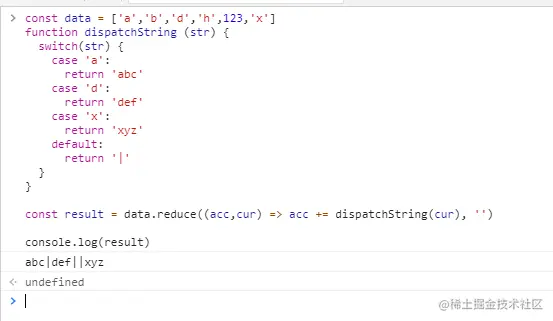 这也是为什么在我们使用 reduce 时,每次方法结束都必须要返回值,若不返回值的话,下个步骤就无法拿到 acc 的值(undefined),就像在工厂流水线中,在某个流程有人把整个产品直接扔掉了,那做下一步工作的人就拿不到这个产品了。