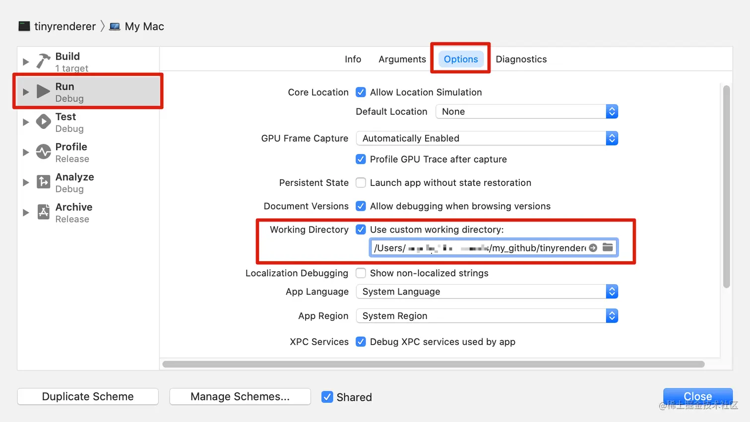 首先按照 Product -> Scheme -> Edit Scheme 的次序,打开一个弹窗。